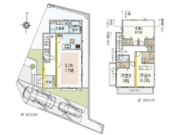 全棟駐車2台の広々とした敷地。ご家族のライフスタイルに合わせて、お好みの間取りをお選びいただけます。