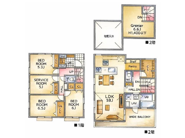 都市ガス、公営水道、公共下水、吹き抜け、省エネルギー対策、駐車場2台以上、閑静な住宅地、平坦地、都市近郊、地盤調査済、市街地が近い、周辺交通量少なめ、スーパーが近い(10分以内)、駅まで平坦、2沿線以上利用可、小学校徒歩10分以内、中学校徒歩10分以内、公園5分以内、システムキッチン、ガスコンロ、ガス3口、カウンタキッチン、対面キッチン、食器洗い機付き、浄水器、パントリー(食器・食品の収納庫)、ユニットバス、追い焚き、浴室乾燥機、ウォシュレット、オートバス付き、トイレ2ヶ所、浴室1坪以上、浴室に窓、暖房便座、節水型トイレ、セカンド洗面台、浴室暖房、バルコニー、テラス、ワイドバルコニー、南面バルコニー、2階建、LDK18畳以上、グルニエ、省エネ給湯器、採光3面、南西向き、フローリング、全室フローリング、スマートキー、クローゼット、収納、床下収納、下駄箱、屋根裏収納、全居室収納、洗面室収納、シューズインクローク、シャンプドレッサー付き、フラット35Sに対応、モニタ付きインターフォン、複層ガラス、火災警報器(報知機)、全居室複層ガラスか複層サッシ、セキュリティ充実、通風良好、陽当り良好、シューズインクローク、対面キッチン、パントリー、都市ガス、建物10年保証、勾配天井