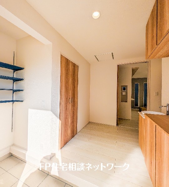 二階に洗面所と浴室を設けた生活動線良好な間取りです。ごみの一時保管や物置との行き来に便利な勝手口有。